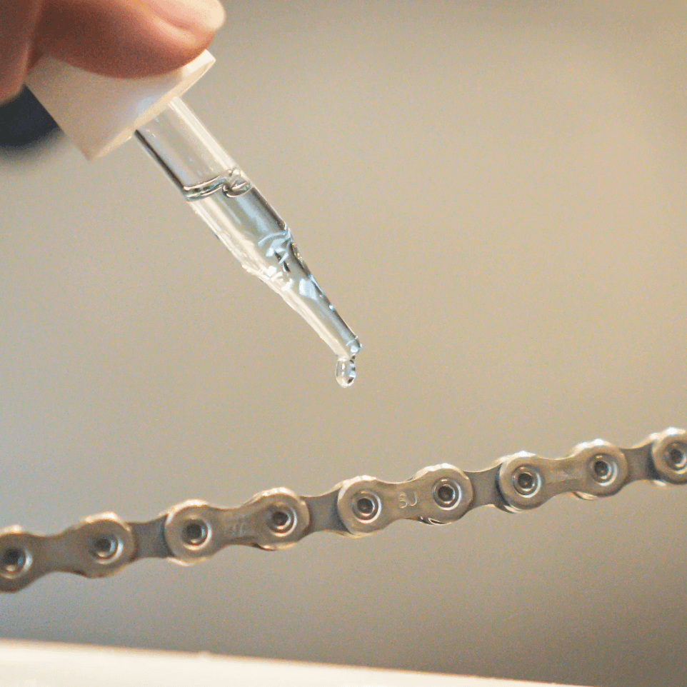 注油する際は自転車チェーンの場合、スポイトを使用し20滴を塗布。特殊な潤滑油により10数秒チェーンを回すことで全体にオイルが行き渡ります。